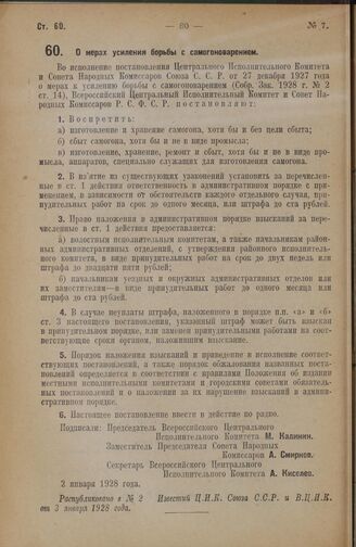 Постановление Всероссийского Центрального Исполнительного Комитета и Совета Народных Комиссаров. О мерах усиления борьбы с самогоноварением. 2 января 1928 года // Распубликовано в № 2 Известий Ц.И.К. Союза С.С.Р. и В.Ц.И.К. от 3 января 1928 года.