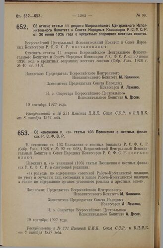 Постановление Всероссийского Центрального Исполнительного Комитета и Совета Народных Комиссаров. Об изменении п. «а» статьи 103 Положения о местных финансах Р.С.Ф.С.Р. 19 сентября 1927 г.