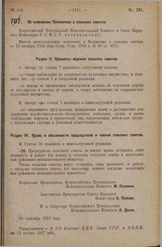 Постановление Всероссийского Центрального Исполнительного Комитета и Совета Народных Комиссаров. Об изменении Положения о сельских советах. 26 сентября 1927 г.