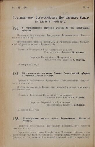 Постановление Всероссийского Центрального Исполнительного Комитета. О переименовании отрубного участка № 213 Оренбургской губернии. 30 января 1928 года