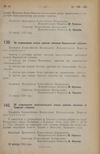 Постановление Всероссийского Центрального Исполнительного Комитета. Об утверждении дополнительного списка рабочих поселков по Тверской губернии. 30 января 1928 года