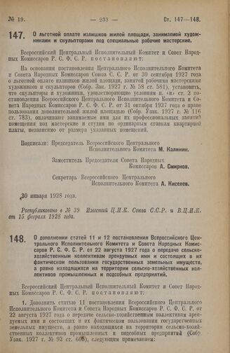 Постановление Всероссийского Центрального Исполнительного Комитета и Совета Народных Комиссаров. О дополнении статей 11 и 12 постановления Всероссийского Центрального Исполнительного Комитета и Совета Народных Комиссаров Р.С.Ф.С.Р. от 22 августа 1927 года о передаче сельскохозяйственным коллективам арендуемых ими и состоящих в их фактическом пользовании государственных земельных имуществ, а равно находящихся на территории сельско-хозяйственных коллективов промышленных и подсобных предприятий. 30 января 1928 года