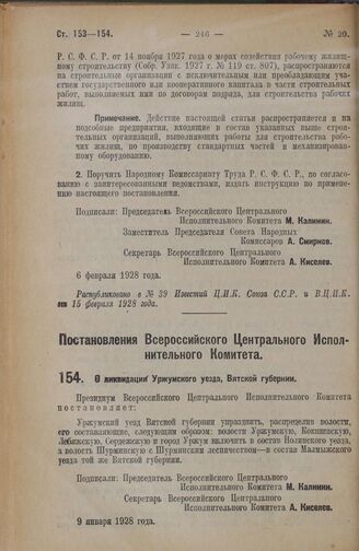 Постановление Всероссийского Центрального Исполнительного Комитета. О ликвидации Уржумского уезда, Вятской губернии. 9 января 1928 года