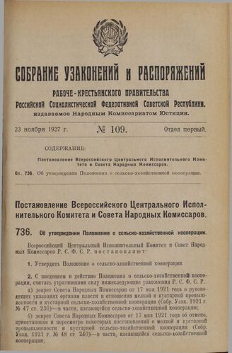 Постановление Всероссийского Центрального Исполнительного Комитета и Совета Народных Комиссаров. Об утверждении Положения о сельско-хозяйственной кооперации. 3 октября 1927 г.