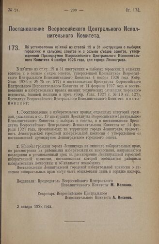 Постановление Всероссийского Центрального Исполнительного Комитета. Об установлении изъятий из статей 19 и 31 инструкции о выборах городских и сельских советов и о созыве съездов советов, утвержденной Президиумом Всероссийского Центрального Исполн...