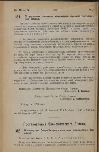 Постановление Совета Народных Комиссаров. Об улучшении положения медицинского персонала психиатрических больниц. 16 февраля 1928 года // Распубликовано в № 50 Известий Ц.И.К. Союза С.С.Р. и В.Ц.И.К. от 28 февраля 1928 года.