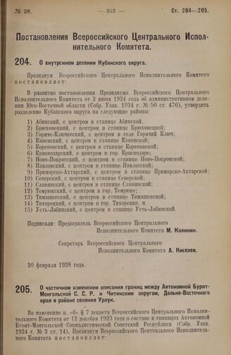 Постановление Всероссийского Центрального Исполнительного Комитета. О внутреннем делении Кубанского округа. 20 февраля 1928 года