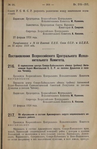 Постановление Всероссийского Центрального Исполнительного Комитета. Об образовании в составе Армавирского округа национального немецкого района. 27 февраля 1928 года