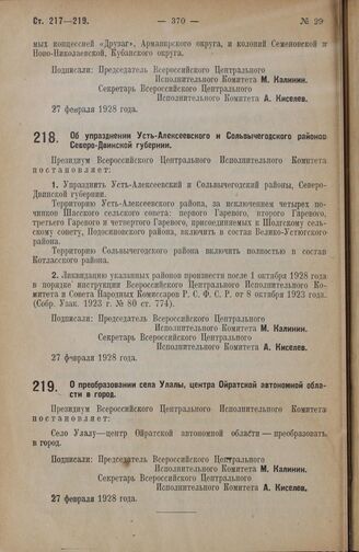 Постановление Всероссийского Центрального Исполнительного Комитета. О преобразовании села Улалы, центра Ойратской автономной области в город. 27 февраля 1928 года