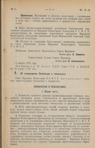 Декрет Совета Народных Комиссаров. Об утверждении Положения о техникумах. 4 января 1926 года