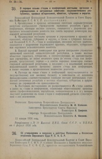 Декрет Всероссийского Центрального Исполнительного Комитета и Совета Народных Комиссаров. Об утверждении и введении в действие Положения о Казанском отделении Верховного Суда Р.С.Ф.С.Р. 18 января 1926 года