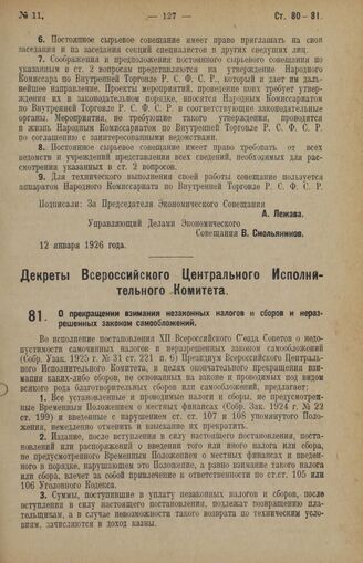 Декрет Всероссийского Центрального Исполнительного Комитета. О прекращении взимания незаконных налогов и сборов и неразрешенных законом самообложений. 18 января 1926 года