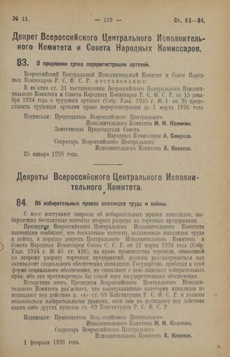 Декрет Всероссийского Центрального Исполнительного Комитета. Об избирательных правах инвалидов труда и войны. 1 февраля 1926 года