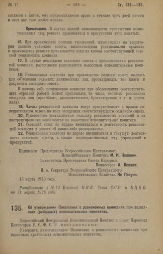 Декрет Всероссийского Центрального Исполнительного Комитета и Совета Народных Комиссаров. Об утверждении Положения о ревизионных комиссиях при волостных (районных) исполнительных комитетах. 15 марта 1926 года // Распубликован в № 73 Известий Ц.И.К. Союза С.С.Р. и В.Ц.И.К. от 31 марта 1926 года.