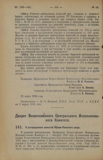 Декрет Всероссийского Центрального Исполнительного Комитета. О распределении волостей Юрьев-Польского уезда. 22 марта 1926 года