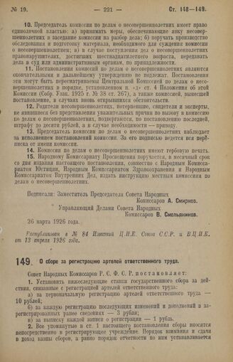 Декрет Совета Народных Комиссаров. О сборе за регистрацию артелей ответственного труда. 26 марта 1926 года