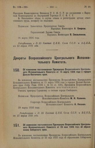 Декрет Всероссийского Центрального Исполнительного Комитета. Об изменении постановления Президиума Всероссийского Центрального Исполнительного Комитета от 15 марта 1926 года о городах Дальне-Восточного края. 29 марта 1926 года