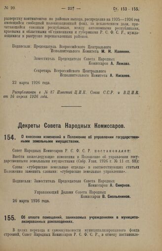 Декрет Совета Народных Комиссаров. Об оплате помещений, занимаемых учреждениями в муниципализированных домовладениях. 26 марта 1926 года // Распубликован в № 87 Известий Ц.И.К. Союза С.С.Р. и В.Ц.И.К. от 16 апреля 1926 года.
