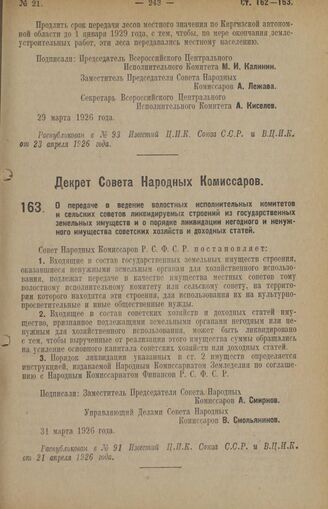 Декрет Совета Народных Комиссаров. О передаче в ведение волостных исполнительных комитетов и сельских советов ликвидируемых строений из государственных земельных имуществ и о порядке ликвидации негодного и ненужного имущества советских хозяйств и доходных статей. 31 марта 1926 года
