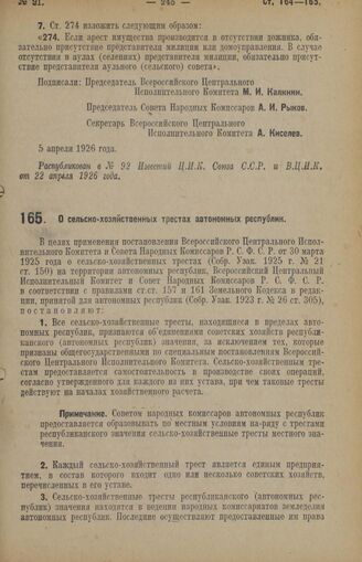 Декрет Всероссийского Центрального Исполнительного Комитета и Совета Народных Комиссаров. О сельско-хозяйственных трестах автономных республик. 5 апреля 1926 года