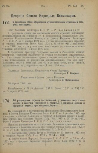 Декрет Совета Народных Комиссаров. Об утверждении перечня постановлений, утративших силу с введением в действие Положения о товарных и фондовых биржах и фондовых отделах при товарных биржах. 10 апреля 1926 года // Распубликован в № 93 Известий Ц.И.К. Союза С.С.Р. и В.Ц.И.К. от 23 апреля 1926 года.