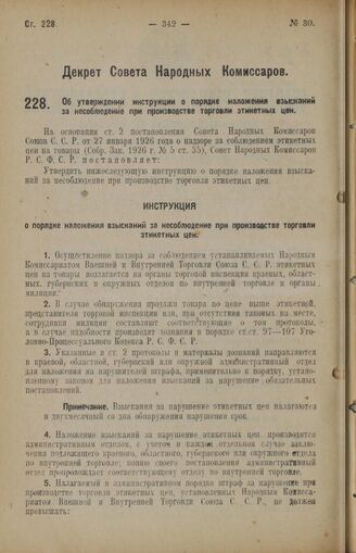 Декрет Совета Народных Комиссаров. Об утверждении инструкции о порядке наложения взысканий за несоблюдение при производстве торговли этикетных цен. 15 мая 1926 года