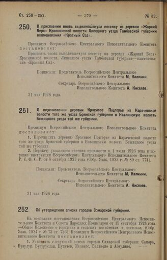 Декрет Всероссийского Центрального Исполнительного Комитета. О присвоении вновь выделившемуся поселку из деревни «Жаркий Верх» Краснинской волости Липецкого уезда Тамбовской губернии наименования «Красный Сад». 31 мая 1926 года