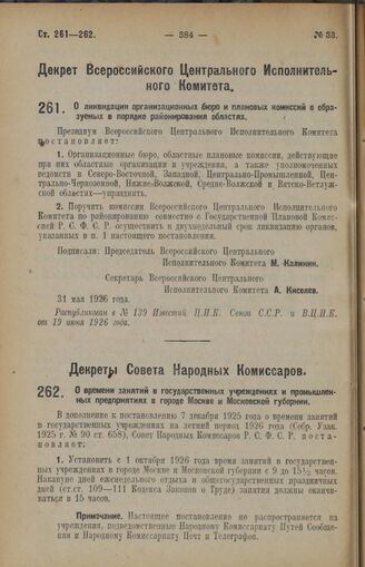 Декрет Совета Народных Комиссаров. О времени занятий в государственных учреждениях и промышленных предприятиях в городе Москве и Московской губернии. 1 июня 1926 года