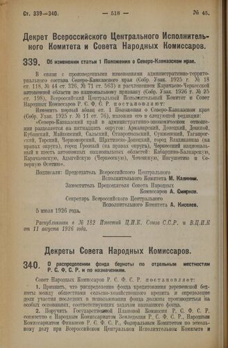 Декрет Всероссийского Центрального Исполнительного Комитета и Совета Народных Комиссаров. Об изменении статьи 1 Положения о Северо-Кавказском крае. 5 июля 1926 года