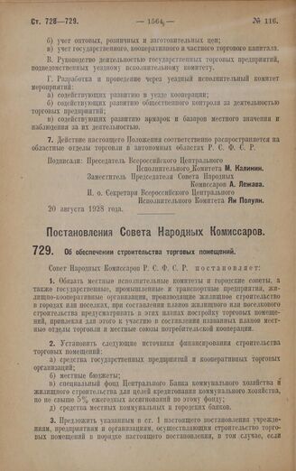 Постановление Совета Народных Комиссаров. Об обеспечении строительства торговых помещений. 4 сентября 1928 года // Распубликовано в № 226 Известий Ц.И.К. Союза С.С.Р. и В.Ц.И.К. от 28 сентября 1928 года.