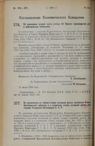 Постановление Экономического Совещания. Об изменении второй части статьи 59 Правил производства дел в арбитражных комиссиях. 31 июля 1926 года // Распубликовано в № 193 Известий Ц.И.К. Союза С.С.Р. и В.Ц.И.К. от 24 августа 1926 года.