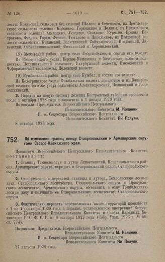 Постановление Всероссийского Центрального Исполнительного Комитета. Об изменении границ между Ставропольским и Армавирским округами Северо-Кавказского края. 27 августа 1928 года