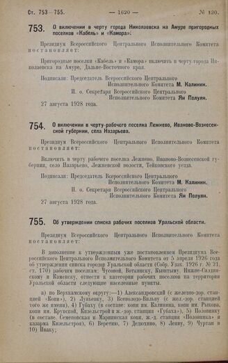 Постановление Всероссийского Центрального Исполнительного Комитета. О включении в черту рабочего поселка Лежнево, Иваново-Вознесенской губернии, села Назарьева. 27 августа 1928 года
