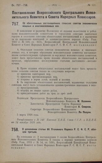 Постановление Всероссийского Центрального Исполнительного Комитета и Совета Народных Комиссаров. Об обязательных постановлениях сельских советов экономически мощных и многонаселенных сел. 5 марта 1928 года // Распубликовано в № 240 Известий Ц.И.К. Союза С.С.Р. и В.Ц.И.К. от 44 октября 1928 года.