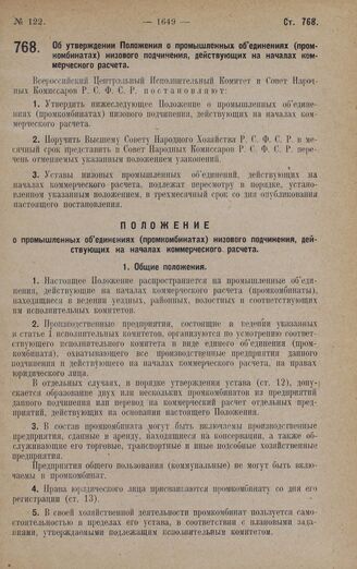 Постановление Всероссийского Центрального Исполнительного Комитета и Совета Народных Комиссаров. Об утверждении Положения о промышленных объединениях (промкомбинатах) низового подчинения, действующих на началах коммерческого расчета. 13 августа 1928 года