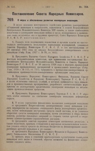 Постановление Совета Народных Комиссаров. О мерах к обеспечению развития кооперации инвалидов. 16 августа 1928 года