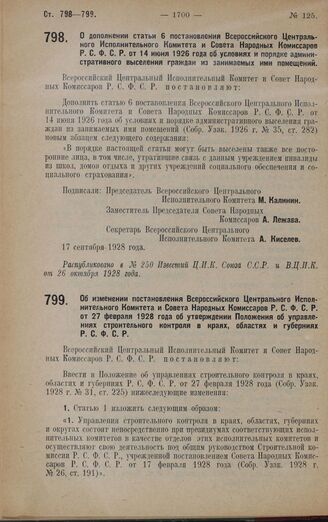 Постановление Всероссийского Центрального Исполнительного Комитета и Совета Народных Комиссаров. О дополнении статьи 6 постановления Всероссийского Центрального Исполнительного Комитета и Совета Народных Комиссаров Р.С.Ф.С.Р. от 14 июня 1926 года об условиях и порядке административного выселения граждан из занимаемых ими помещений. 17 сентября 1928 года // Распубликовано в № 250 Известий Ц.И.К. Союза С.С.Р. и В.Ц.И.К. от 26 октября 1928 года.