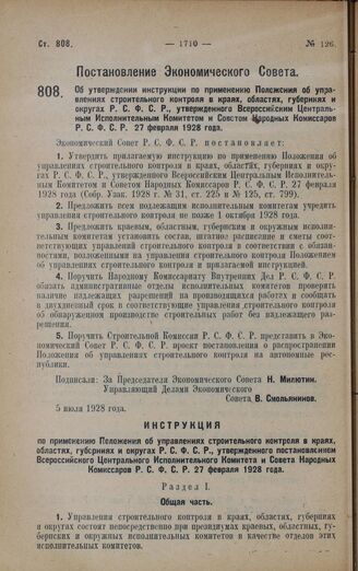 Постановление Экономического Совета. Об утверждении инструкции по применению Положения об управлениях строительного контроля в краях, областях, губерниях и округах Р.С.Ф.С.Р., утвержденного Всероссийским Центральным Исполнительным Комитетом и Сове...