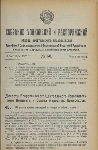 Декрет Всероссийского Центрального Исполнительного Комитета и Совета Народных Комиссаров. Об оплате жилых помещений в городах и рабочих поселках. 23 августа 1926 года