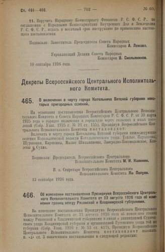 Декрет Всероссийского Центрального Исполнительного Комитета. О включении в черту города Котельнича Вятской губернии некоторых пригородных селений. 13 сентября 1926 года