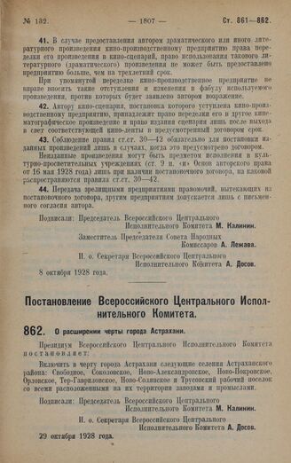 Постановление Всероссийского Центрального Исполнительного Комитета. О расширении черты города Астрахани. 29 октября 1928 года