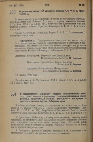 Декрет Всероссийского Центрального Исполнительного Комитета и Совета Народных Комиссаров. О дополнении статьи 157 Земельного Кодекса Р.С.Ф.С.Р. примечанием 2. 11 октября 1926 года