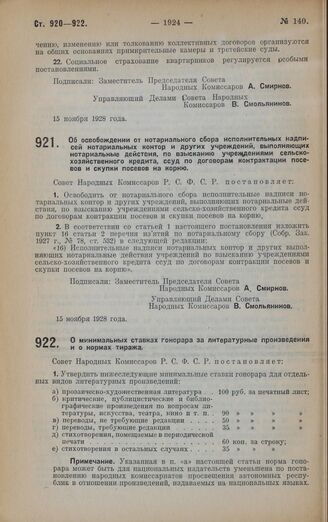 Постановление Совета Народных Комиссаров. О минимальных ставках гонорара за литературные произведения и о нормах тиража. 20 ноября 1928 года // Распубликовано в № 272 Известий Ц.И.К. Союза С.С.Р. и В.Ц.И.К. от 23 ноября 1928 года.