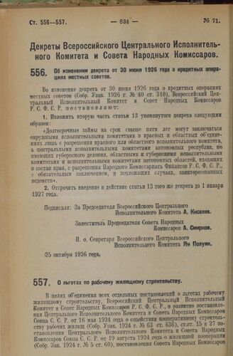 Декрет Всероссийского Центрального Исполнительного Комитета и Совета Народных Комиссаров. О льготах по рабочему жилищному строительству. 25 октября 1926 года