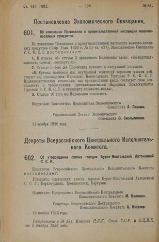 Декрет Всероссийского Центрального Исполнительного Комитета. Об утверждении списка городов Бурят-Монгольской Автономной С.С.Р. 15 ноября 1926 года