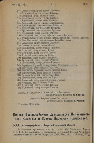 Декрет Всероссийского Центрального Исполнительного Комитета и Совета Народных Комиссаров. О землеустройстве в Ингушской автономной области. 29 ноября 1926 года