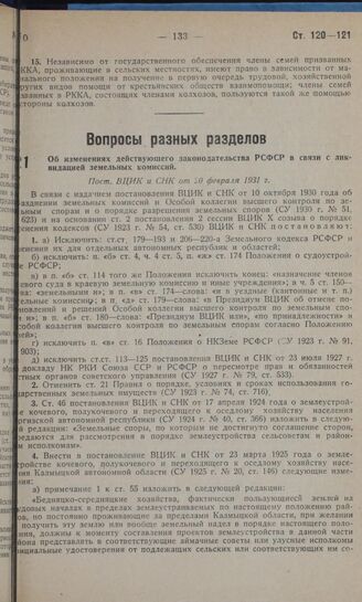 Об изменениях действующего законодательства РСФСР в связи с ликвидацией земельных комиссий. Пост. ВЦИК и СНК от 20 февраля 1931 г.