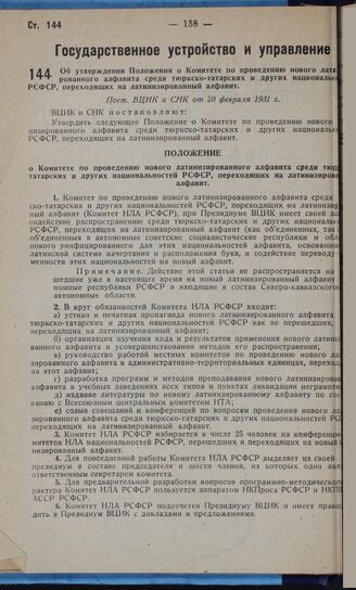 Об утверждении Положения о Комитете по проведению нового латинизированного алфавита среди тюркско-татарских и других национальностей РСФСР, переходящих на латинизированный алфавит. Пост. ВЦИК и СНК от 20 февраля 1931 г.
