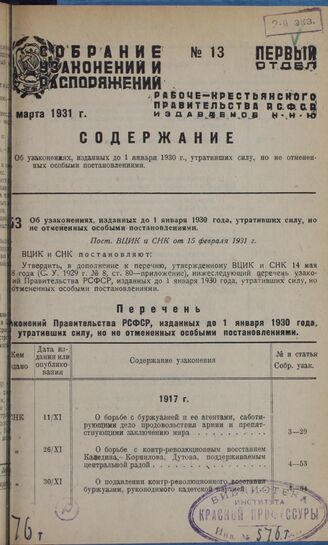 Главная Собрание законов и распоряжений правительства РСФСР и СССР Собрание законов и распоряжений Рабоче-Крестьянского Правительства ... Собрание узаконений и распоряжений Рабочего и Крестьянского правите... Собрание узаконений и распоряжений Рабоче-Крестьянского правительст... Документы Об узаконениях, изданных до 1 января 1930 года, утративших силу, но...