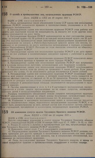 Об изменении статута ордена Трудового Красного знамени РСФСР. Пост. ВЦИК и СНК от 20 марта 1931 г.